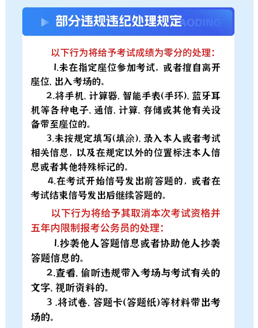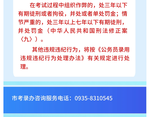 (十)考生須認真閱讀筆試有關(guān)規(guī)定,遵守考場規(guī)則,服從考務(wù)人員管理,接受監(jiān)考人員的監(jiān)督和檢查。對有作弊行為、無理取鬧、不配合考務(wù)人員進行相關(guān)詢問等造成嚴重后果的,或威脅、侮辱、誹謗、誣陷工作人員或其他考生的,將按《公務(wù)員錄用違規(guī)違紀行為處理辦法》等相關(guān)規(guī)定嚴肅處理。替考、電子作弊等違反《中華人民共和國刑法修正案(九)》等法律法規(guī)構(gòu)成犯罪的,依法追究刑事責(zé)任。