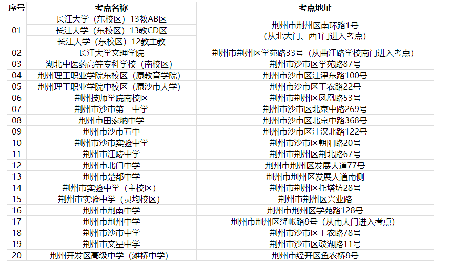 荊州市荊州區(qū)學苑路33號(從曲江路學校南門進入考點)