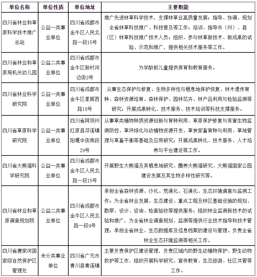 根據(jù)《事業(yè)單位人事管理條例》《事業(yè)單位公開招聘人員暫行規(guī)定》和《四川省省屬事業(yè)單位公開招聘工作人員實施細則(試行)》等有關(guān)規(guī)定,四川省林業(yè)和草原局擬面向社會公開招聘部分工作人員補充到四川省林業(yè)和草原科學(xué)技術(shù)推廣總站等7個直屬事業(yè)單位工作?,F(xiàn)將公開招聘有關(guān)事項公告如下(本公告由四川省林業(yè)和草原局同時在四川省人力資源和社會保障廳官網(wǎng) 〔rst.sc.gov.cn,下同〕“人事考試”專欄上發(fā)布。