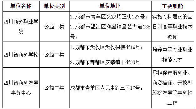 根據(jù)《事業(yè)單位人事管理條例》《事業(yè)單位公開招聘人員暫行規(guī)定》和《四川省省屬事業(yè)單位公開招聘工作人員實施細則(試行)》等有關(guān)規(guī)定,四川省商務(wù)廳擬面向社會公開招聘部分工作人員補充到四川商務(wù)職業(yè)學(xué)院、四川省商務(wù)學(xué)校、四川省商務(wù)發(fā)展事務(wù)中心等3個下屬事業(yè)單位工作?,F(xiàn)將公開招聘有關(guān)事項公告如下(本公告由四川省商務(wù)廳同時在四川省人力資源和社會保障廳官網(wǎng)[rst.sc.gov.cn,下同]“人事考試”專欄和四川省商務(wù)廳官網(wǎng)[swt.sc.gov.cn,下同]上發(fā)布。)