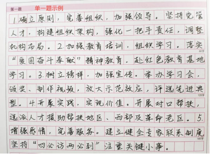 卷面整潔干凈:書寫時(shí)注意分條撰寫,標(biāo)清序號(hào)。一般情況下,單一題需要分條羅列答案要點(diǎn),標(biāo)清序號(hào);綜合題主體分析內(nèi)容最好分條撰寫,標(biāo)清序號(hào)。標(biāo)清序號(hào)時(shí)可用一、二、三、……;1.2.3.……等形式,考慮字?jǐn)?shù)有限,建議優(yōu)先使用1.2.3.……。
