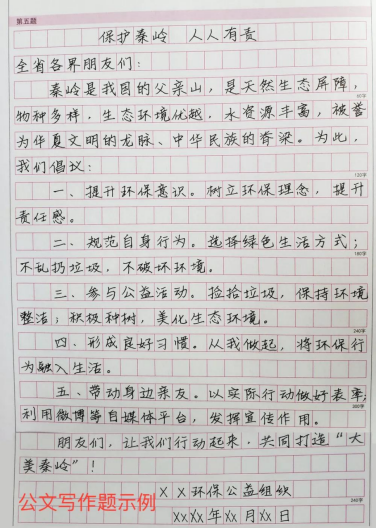 一篇文章的完整結(jié)構(gòu)應(yīng)該包括:“標(biāo)題”“開頭”“過渡段”“主體部分”“結(jié)尾”五個(gè)部分。其中,“過渡段”可寫可不寫,其他四個(gè)部分缺一不可?!伴_頭”“過渡段”“主體部分”“結(jié)尾”都需要分段撰寫,每段首句需左空兩格。其他書寫要求如下: