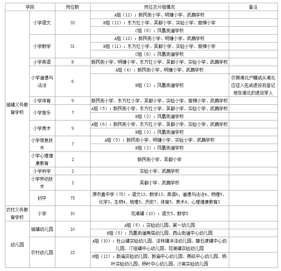 備注:為了體現(xiàn)招聘教師公平、公正原則,確保規(guī)定的時(shí)間內(nèi)完成同一崗位面試工作,區(qū)分原市直學(xué)校和街道學(xué)校,將城鎮(zhèn)義務(wù)教育學(xué)校部分小學(xué)崗位和幼兒園崗位進(jìn)行了分組,請(qǐng)考生在報(bào)名時(shí)注意崗位分組情況,按需報(bào)崗。