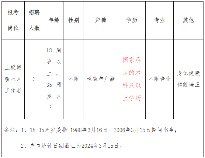 本次擬公開招聘崗位1個,共計3人。具體招聘崗位和條件詳見附件《承德高新區(qū)2024年公開招聘社區(qū)工作者崗位信息表》。