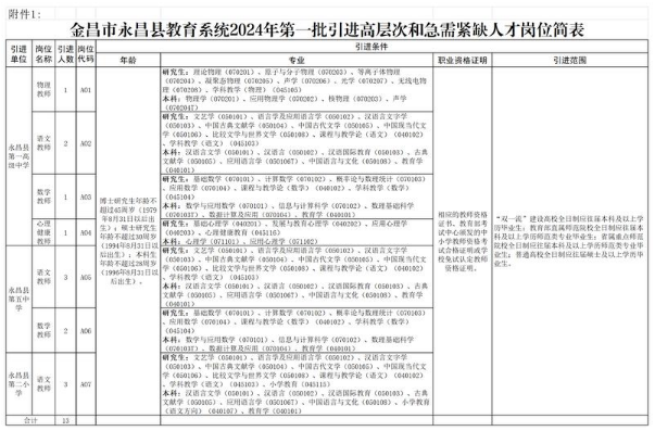 永昌縣教育系統(tǒng)2024年第一批計劃引進高層次和急需緊缺人才共13名,具體崗位和條件詳見《金昌市永昌縣教育系統(tǒng)2024年第一批引進高層次和急需緊缺人才崗位簡表》(附件1,以下簡稱《崗位簡表》)。