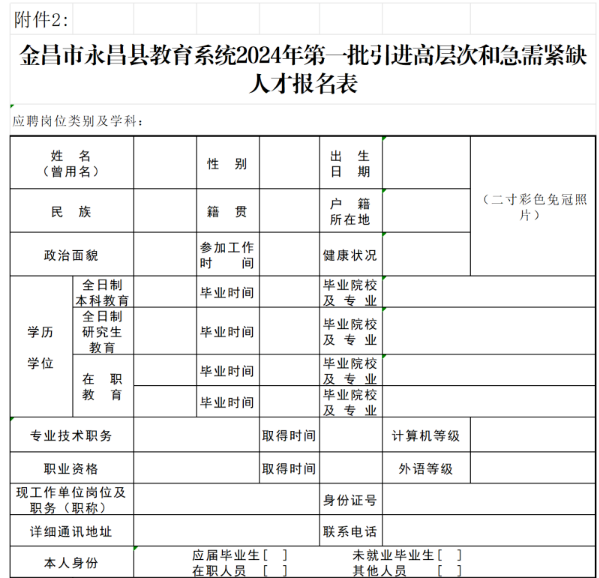 2.金昌市永昌縣教育系統(tǒng)2024年第一批引進高層次和急需緊缺人才報名表