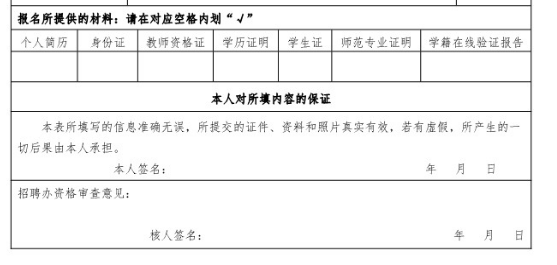 現(xiàn)場(chǎng)資格審核時(shí),應(yīng)聘者需提供《鎮(zhèn)平縣2024年校園招聘教師報(bào)名表》,報(bào)名表一式2份;提供本人有效身份證、學(xué)生證原件及復(fù)印件,學(xué)信網(wǎng)下載的《教育部學(xué)籍在線驗(yàn)證報(bào)告》,所在院校出具的在讀學(xué)歷層次、所學(xué)專業(yè)、是否為師范專業(yè)等內(nèi)容的證明。