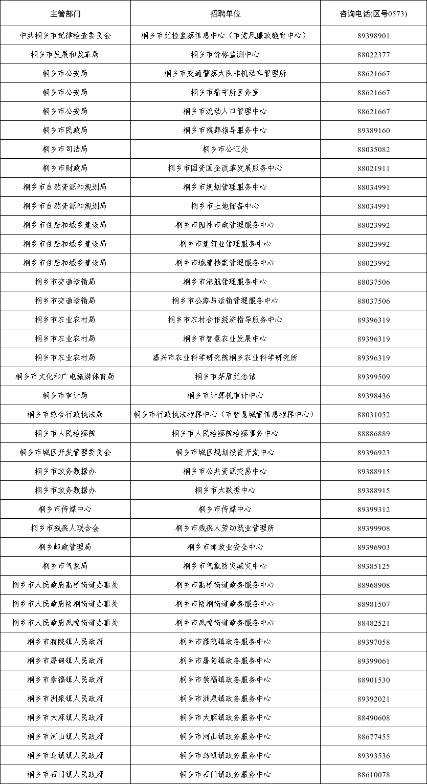本次我市事業(yè)單位計(jì)劃招聘工作人員68名。具體的招聘單位、招聘崗位、人數(shù)和相關(guān)要求等詳見《2024年桐鄉(xiāng)市事業(yè)單位公開招聘工作人員計(jì)劃及崗位要求表》(以下簡稱《計(jì)劃及崗位要求表》),可登錄下列網(wǎng)站查詢:
