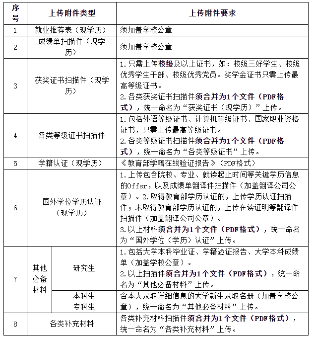 3.上傳應(yīng)聘附件材料。應(yīng)聘畢業(yè)生須通過招聘平臺及時(shí)、規(guī)范上傳個(gè)人應(yīng)聘附件材料,確保應(yīng)聘材料能正常打開、清晰顯示,應(yīng)聘附件材料文檔數(shù)量不超過8個(gè)。因應(yīng)聘材料不能正常打開、圖像不清晰或未按規(guī)范要求填報(bào)導(dǎo)致的結(jié)果由應(yīng)聘畢業(yè)生本人承擔(dān)。上傳附件具體要求如下: