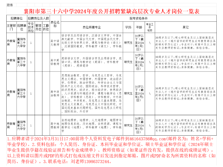 (一)襄陽市第三十六中學(xué)擬公開招聘緊缺高層次專業(yè)人才4名。崗位條件詳情見《襄陽市第三十六中學(xué)2024年度公開招聘緊缺高層次專業(yè)人才崗位一覽表》。