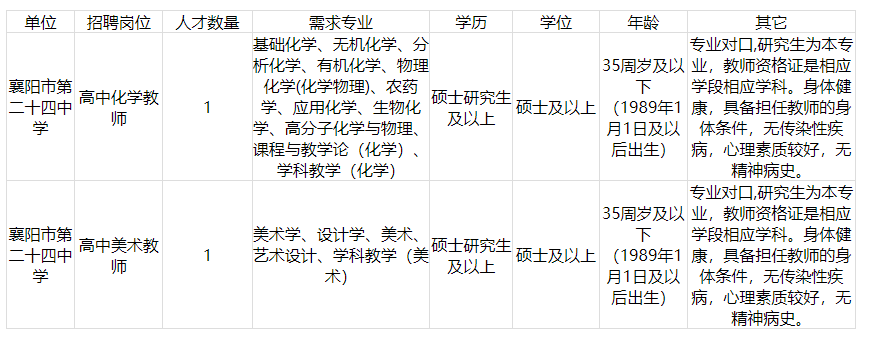 襄陽市第二十四中學2024年度公開招聘緊缺高層次專業(yè)人才崗位一覽表