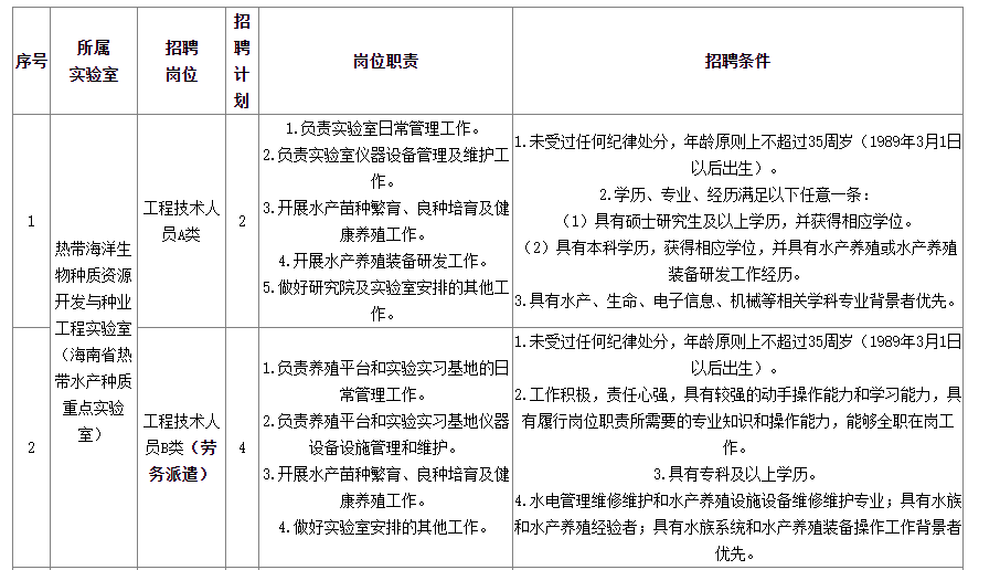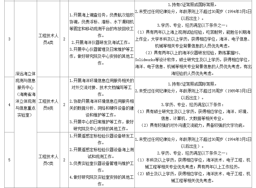 本次招聘16名工程技術(shù)人員,其中,熱帶海洋生物種質(zhì)資源開(kāi)發(fā)與種業(yè)工程實(shí)驗(yàn)室(海南省熱帶水產(chǎn)種質(zhì)重點(diǎn)實(shí)驗(yàn)室)6名;深遠(yuǎn)海立體觀測(cè)與信息服務(wù)中心(海南省海洋立體觀測(cè)與信息重點(diǎn)實(shí)驗(yàn)室)6名;海洋功能材料與防護(hù)技術(shù)創(chuàng)新中心4名。