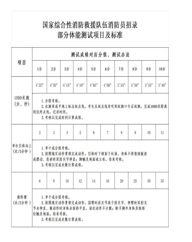 ?。ǘ┵Y格審查通過者全部參加體能測試,測試項目:1000米、俯臥撐、單杠引體向上。考核標(biāo)準(zhǔn)按照《國家綜合性消防救援隊伍消防員招錄體能測試標(biāo)準(zhǔn)》執(zhí)行。