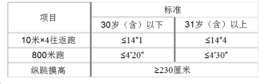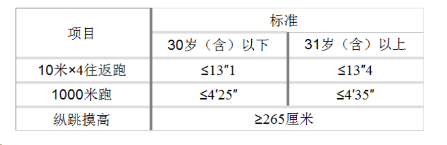體能測(cè)評(píng)的項(xiàng)目和標(biāo)準(zhǔn)按照國(guó)家有關(guān)規(guī)定執(zhí)行,具體如下: