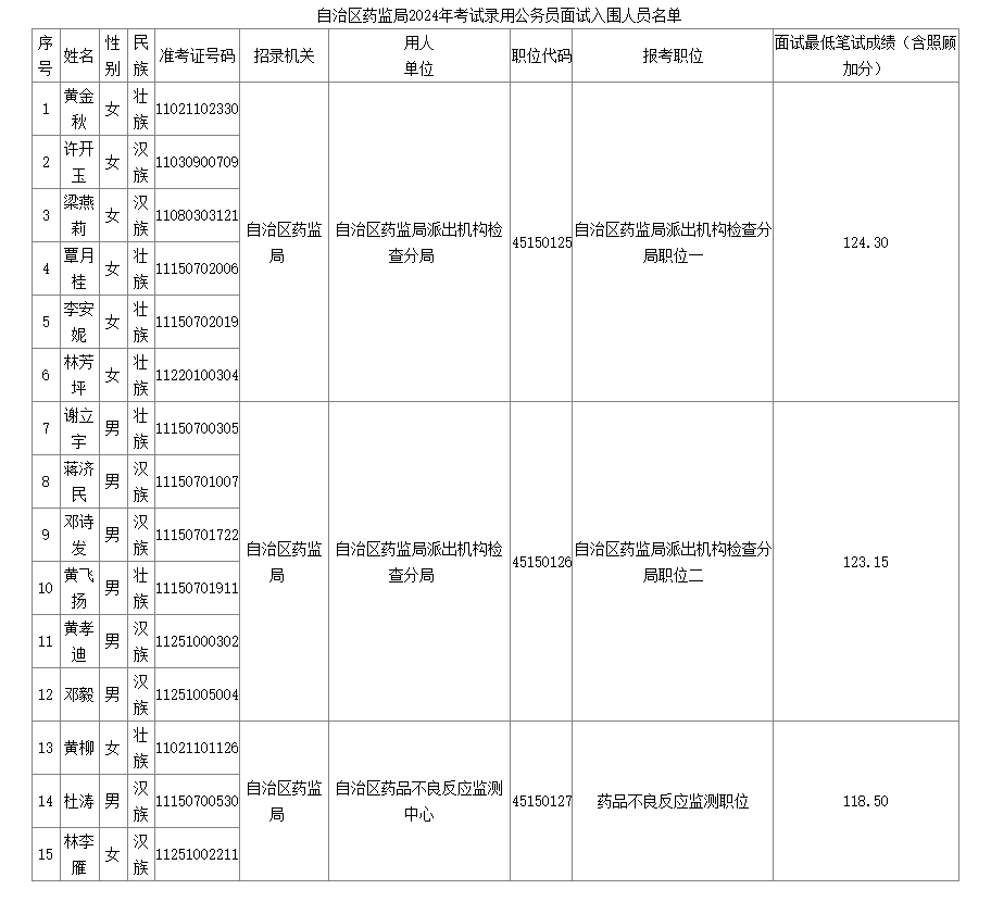 附件:1. 自治區(qū)藥監(jiān)局2024年考試錄用公務員面試入圍人員名單
