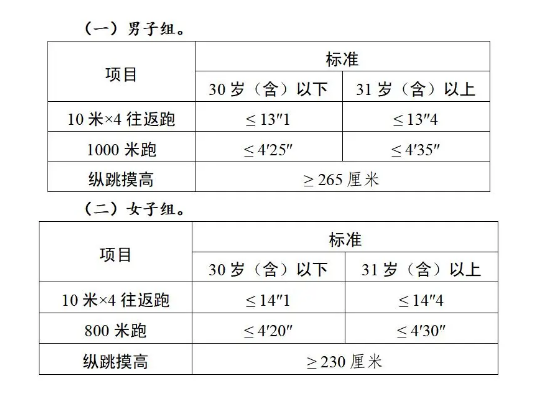體能測評三項(xiàng)全部達(dá)標(biāo)方為合格。報考緊缺職位的人員,體能測評三項(xiàng)中有二項(xiàng)達(dá)標(biāo)的,視為合格。其中:縱跳摸高的測試次數(shù)不超過3次,10米×4往返跑的測試次數(shù)不超過2次,1000米跑/800米跑的測評次數(shù)為1次。