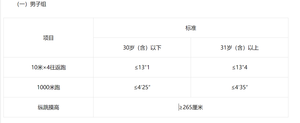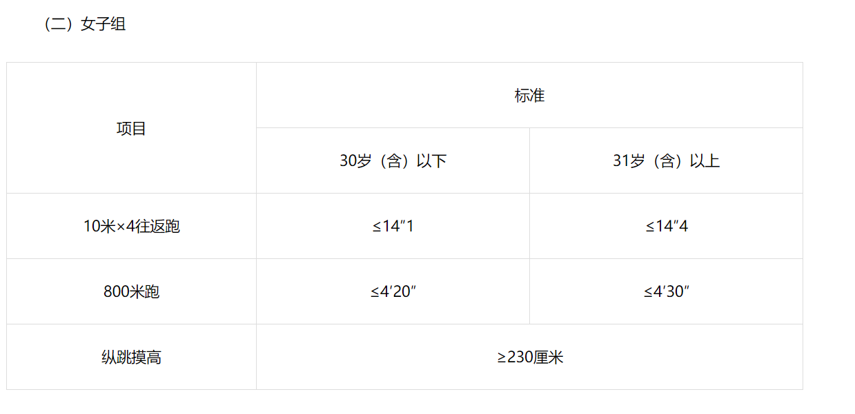 體能測評三項全部達標方為合格。報考緊缺職位的人員,體能測評項目三項中有兩項達標的,視為合格。體能測評項目中,男子1000米跑、女子800米跑兩個項目的測評次數(shù)均為1次,10米×4往返跑測評次數(shù)不超過2次,縱跳摸高的測評次數(shù)不超過3次。