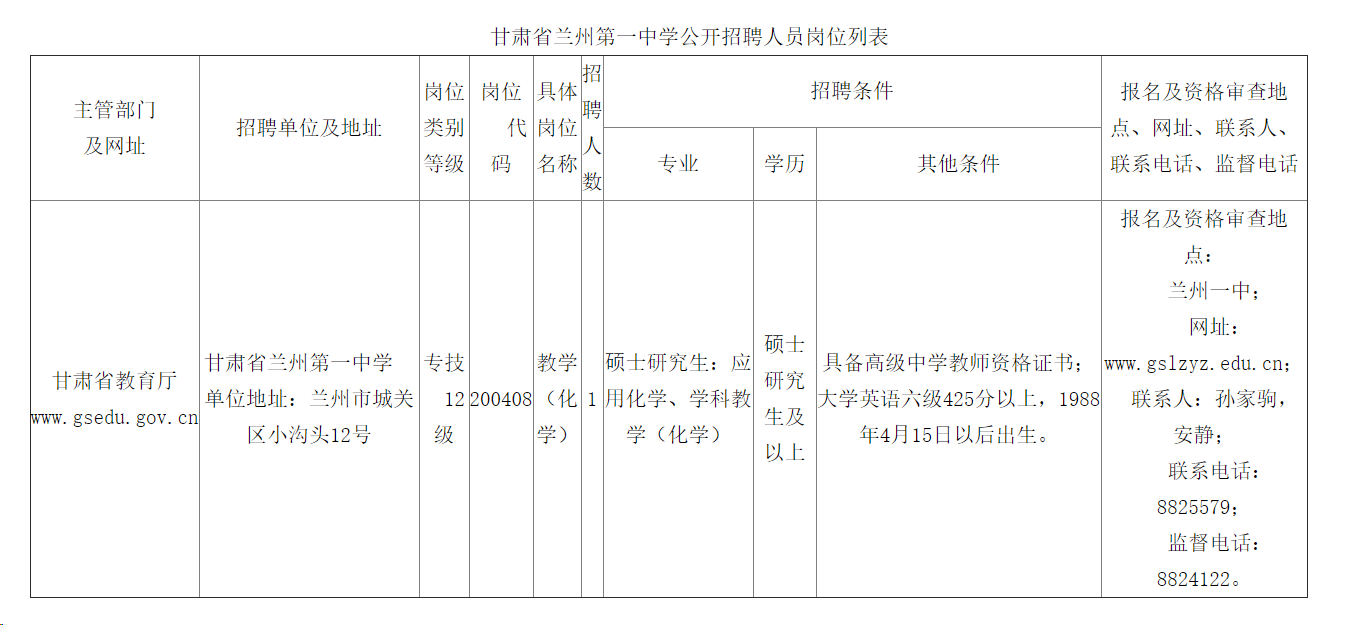 ?。┱衅腹嬖诟拭C省人力資源和社會(huì)保障廳網(wǎng)站(http://www.rst.gansu.gov.cn)和甘肅省蘭州第一中學(xué)官方網(wǎng)站(http://www.gslzyz.cn)公布。具體崗位招聘條件《崗位列表》見附件。