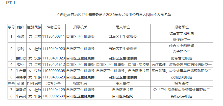 附件:1.廣西壯族自治區(qū)衛(wèi)生健康委員會2024年考試錄用公務(wù)員入圍體檢人員名單