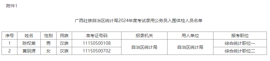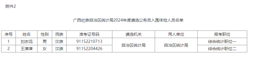 附件:1.廣西壯族自治區(qū)統(tǒng)計(jì)局2024年度考試錄用公務(wù)員入圍體檢人員名單