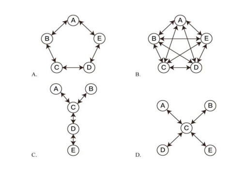 【答案】D【解析】第一步:找出定義要點(diǎn)。輪式網(wǎng)絡(luò):“一個(gè)下級(jí)同時(shí)與多個(gè)主管聯(lián)系”、“主管之間沒有溝通的情形”;Y式網(wǎng)絡(luò):“第二級(jí)有兩個(gè)上級(jí)與之聯(lián)系”、“第三級(jí)與一個(gè)或更多下級(jí)發(fā)生聯(lián)系”;環(huán)式網(wǎng)絡(luò):“每個(gè)成員僅與相鄰者聯(lián)系”、“不能與更遠(yuǎn)的成員進(jìn)行溝通”;全通道式網(wǎng)絡(luò):“所有成員間充分進(jìn)行溝通”、“所有成員的地位是平等的,無核心人物”。第二步:逐一分析選項(xiàng)。A項(xiàng):每個(gè)字符只與其相鄰的兩個(gè)字符間有聯(lián)系,與其他不相鄰的沒有聯(lián)系,符合“每個(gè)成員僅與相鄰者聯(lián)系”、“不能與更遠(yuǎn)的成員進(jìn)行溝通”,符合“環(huán)式網(wǎng)絡(luò)”定義,不符合“輪式網(wǎng)絡(luò)”定義,排除;B項(xiàng):每個(gè)字符與其他所有字符都有聯(lián)系,而且無核心字符,符合“所有成員間充分進(jìn)行溝通”、“所有成員的地位是平等的,無核心人物”,符合“全通道式網(wǎng)絡(luò)”定義,不符合“輪式網(wǎng)絡(luò)”定義,排除;C項(xiàng):字符C分別與兩個(gè)上級(jí)字符A、B以及一個(gè)下級(jí)字符D有聯(lián)系,符合“第二級(jí)有兩個(gè)上級(jí)與之聯(lián)系”、“第三級(jí)與一個(gè)或更多下級(jí)發(fā)生聯(lián)系”,符合“Y式網(wǎng)絡(luò)”定義,不符合“輪式網(wǎng)絡(luò)”定義,排除;D項(xiàng):字符C作為下屬時(shí),分別與多個(gè)主管字符A、B、C、D有聯(lián)系,但是主管字符A、B、C、D之間沒有聯(lián)系,符合“一個(gè)下級(jí)同時(shí)與多個(gè)主管聯(lián)系”、“主管之間沒有溝通的情形”,符合“輪式網(wǎng)絡(luò)”定義,當(dāng)選。