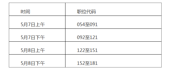 時間:2024年5月7一8日(上午8:30-11:30;下午2:30-5:30)。按報考職位代碼劃分復審時段如下: