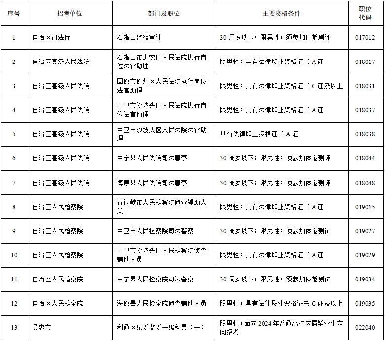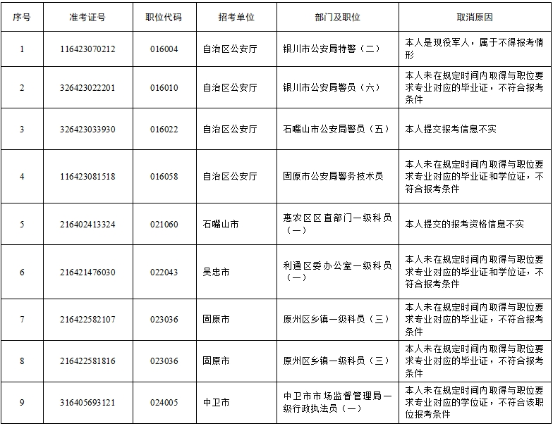 根據(jù)《寧夏回族自治區(qū)2024年考試錄用公務(wù)員公告》相關(guān)規(guī)定,自治區(qū)公務(wù)員局會同有關(guān)部門及各招錄機關(guān)對2024年全區(qū)考試錄用公務(wù)員擬進入面試的報考者進行了資格復(fù)審。復(fù)審中發(fā)現(xiàn),部分報考者不符合職位資格條件,部分報考者放棄面試資格,個別職位達不到面試開考比例。經(jīng)自治區(qū)公務(wù)員主管部門研究,決定取消部分報考者面試資格,降低部分職位面試開考比例?,F(xiàn)將有關(guān)情況公告如下: