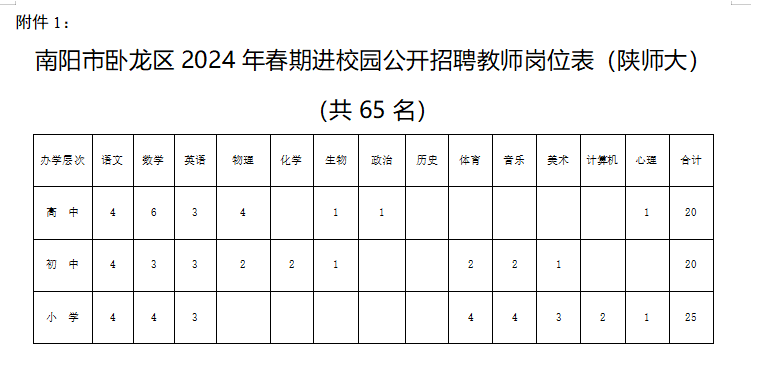 進(jìn)校園公開招聘教師65名。具體崗位詳見《南陽市臥龍區(qū)2024年春期進(jìn)校園公開招聘教師崗位表》(附件1)。