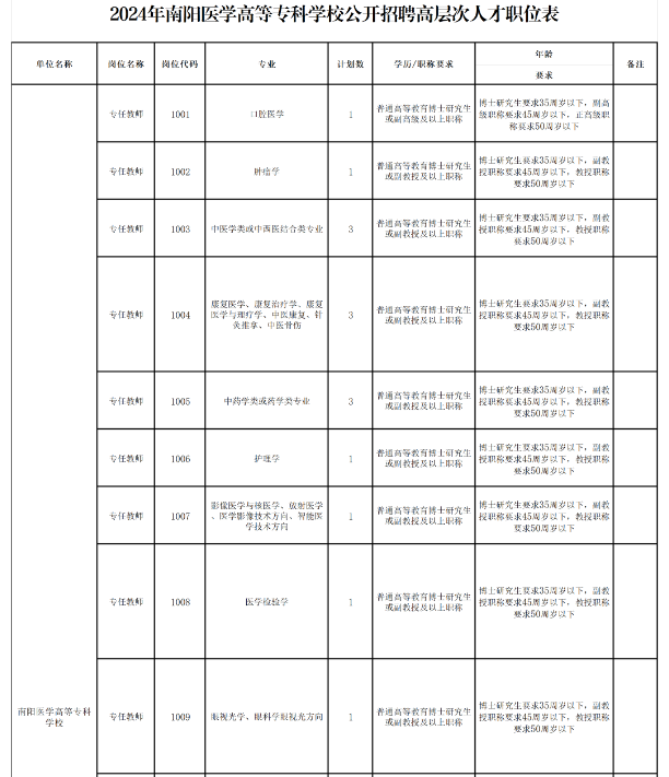 附件1.2024年南陽醫(yī)學(xué)高等??茖W(xué)校公開招聘高層次人才職位表
