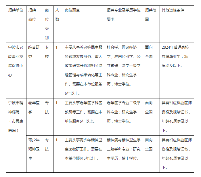 根據(jù)《寧波市事業(yè)單位公開招聘工作人員實(shí)施辦法》的有關(guān)規(guī)定,寧波市民政局所屬事業(yè)單位寧波市老齡事業(yè)發(fā)展促進(jìn)中心和寧波市精神病院(市民康醫(yī)院)決定面向全國(guó)公開招聘高層次人才3名。現(xiàn)就有關(guān)事項(xiàng)公告如下: