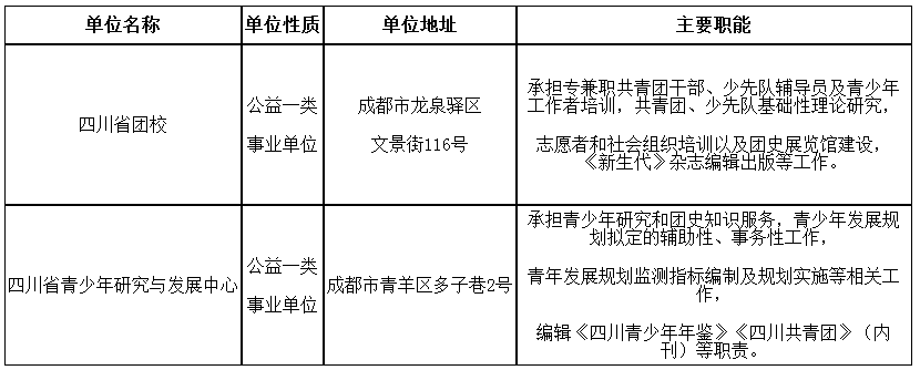 本次選調(diào)涉及我委直屬四川省團校、四川省青少年研究與發(fā)展中心共2家事業(yè)單位3個崗位(共3個選調(diào)名額)。其中,四川省團校2個崗位(2個選調(diào)名額),四川省青少年研究與發(fā)展中心1個崗位(1個選調(diào)名額)。