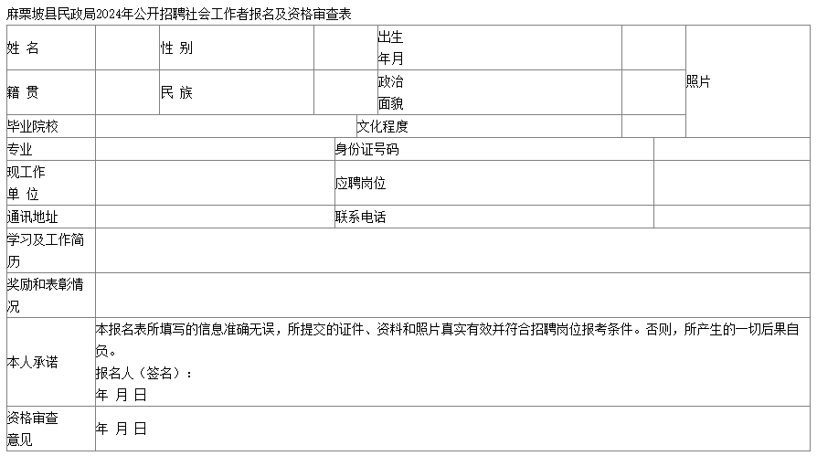 4.報(bào)名須提供的材料:符合招聘條件及崗位要求的人員,下載《麻栗坡縣民政局社會(huì)工作者報(bào)名及資格審查表》電子版填報(bào)并打印1份;身份證(戶口簿)、畢業(yè)證、學(xué)位證、工作經(jīng)歷證明(由原單位出具)原件及復(fù)印件1份;本人近期免冠小一寸彩色照片2張。