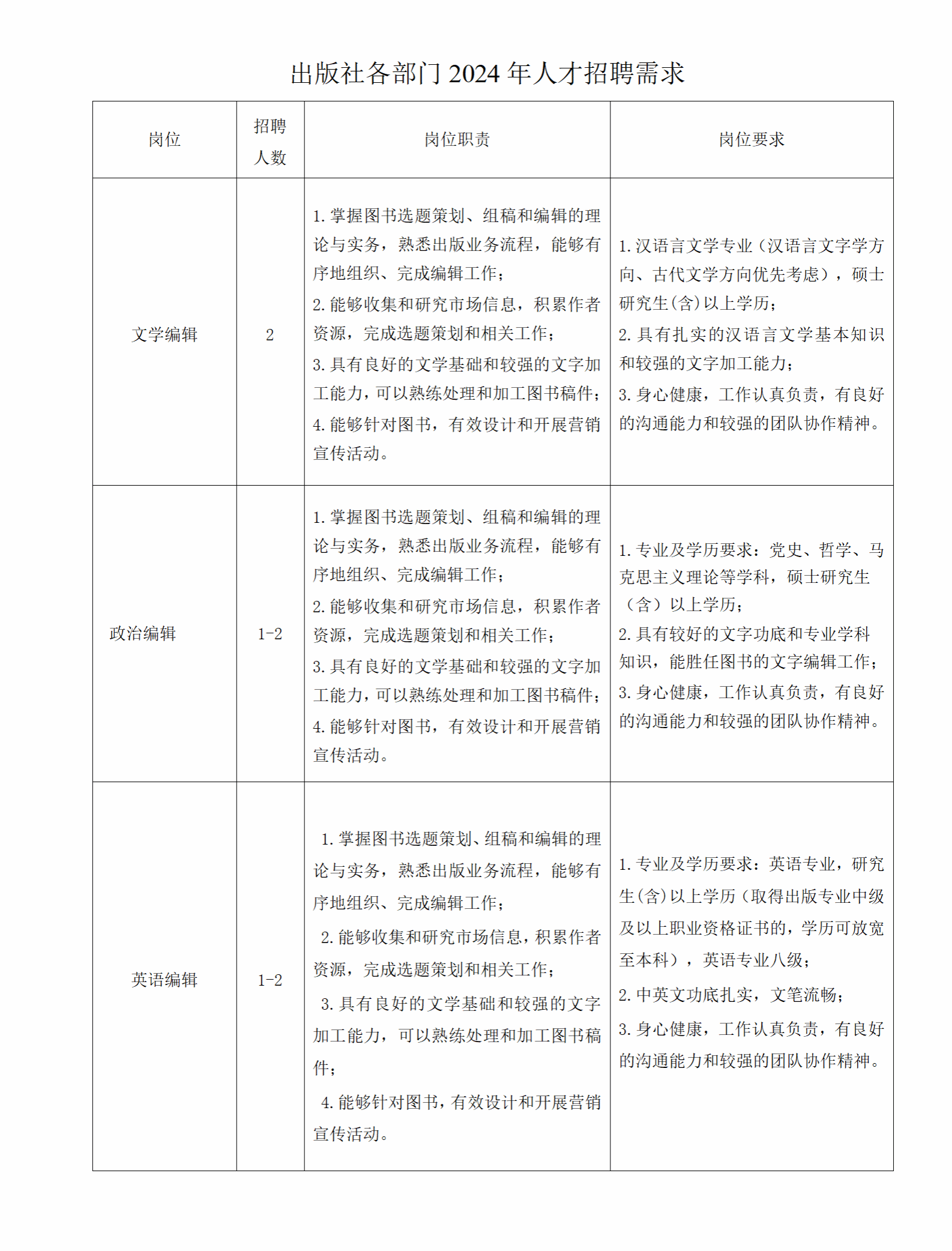 4.有編輯出版相關(guān)工作經(jīng)驗(yàn)者,可優(yōu)先考慮。取得出版專業(yè)中級及以上職稱人員、取得博士學(xué)位人員、博士后出站人員應(yīng)聘時(shí)免筆試。