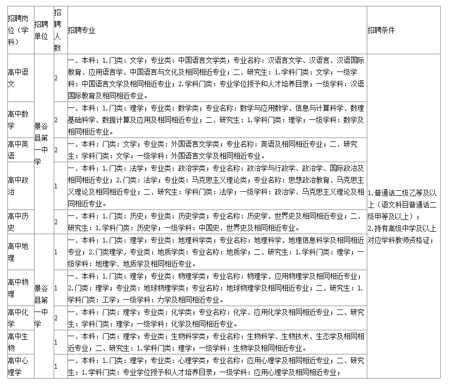 高中教師:語(yǔ)文2名,數(shù)學(xué)2名,英語(yǔ)2名,政治1名,歷史2名,地理1名,物理1名,化學(xué)2名,生物1名,心理學(xué)1名。