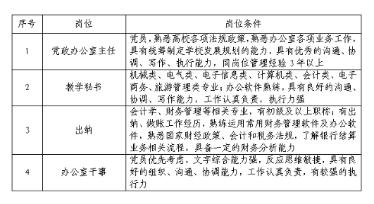 5.專任教師崗具有崗位所需專業(yè)或技能條件,具有高校教學(xué)經(jīng)驗(yàn)、中級(jí)以上專業(yè)技術(shù)職務(wù)或具有行業(yè)、企業(yè)工作經(jīng)歷優(yōu)先考慮,條件可適當(dāng)放寬;