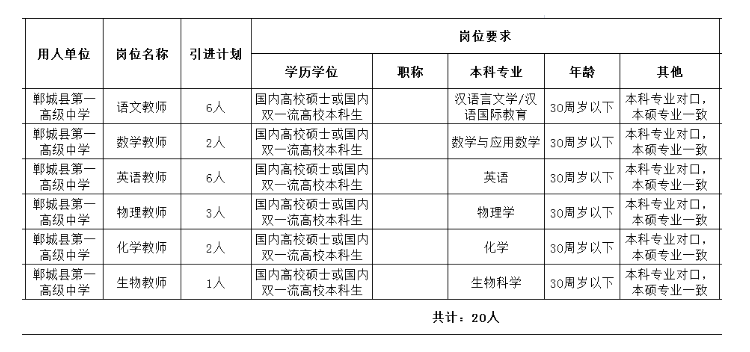 根據(jù)鄲城縣第一高級中學編制、崗位空缺及教學需要,面向社會公開招聘高學歷教師20名(其中語文6名、數(shù)學2名、英語6名、物理3名、化學2名、生物1名)。