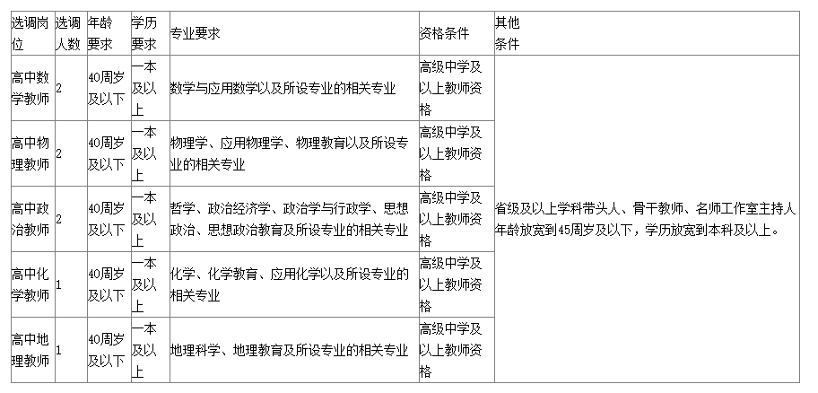 (4)具有一本及以上學(xué)歷,其中省級(jí)及以上學(xué)科帶頭人、骨干教師、名師工作室主持人年齡放寬到本科及以上;具有選調(diào)崗位所需的專業(yè)或任職資格、職業(yè)(執(zhí)業(yè))及技能要求,近三年年度履職考核結(jié)果均為合格及其以上,身體健康。
