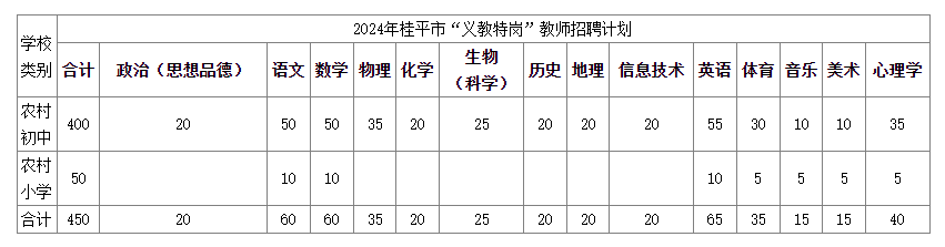 經自治區(qū)教育廳、黨委編辦、財政廳、人社廳批準,2024年桂平市“義教特崗”教師招聘計劃共450名,其中初中400名、小學50名。詳情見下表: