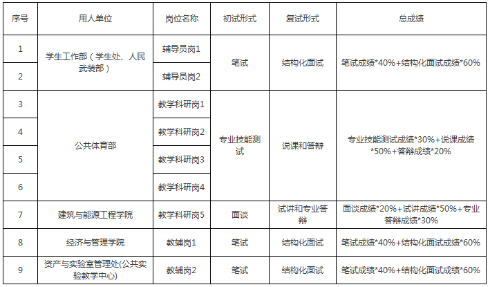 3.復(fù)試。復(fù)試采用結(jié)構(gòu)化面試、試講和專業(yè)答辯等方式,復(fù)試成績按規(guī)定比例計入總成績,總成績計算方式參照下表。復(fù)試成績采用百分制,滿分為100分,合格分為70分。復(fù)試成績低于70分者,不能列為體檢、考察對象。具體安排另行通知。