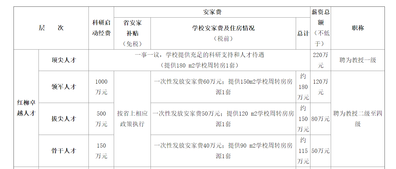 ?。ㄒ唬┘t柳卓越人才四個層次,即頂尖人才、領(lǐng)軍人才、拔尖人才和骨干人才,享受事業(yè)單位工資待遇、校內(nèi)績效津貼及學(xué)校福利(具體見下表)。其中,校內(nèi)績效津貼享受學(xué)??冃Ы蛸N制度校級特設(shè)崗位的津貼標準,分別為200萬元/年(稅前)、100萬元/年(稅前)、60萬元/年(稅前)、30萬元/年(稅前);提供周轉(zhuǎn)房一套,面積分別為180m2、150m2、120m2、90m2。也可以采取“一事一議、一人一策”的方式,由學(xué)校確定配套待遇等。(紅柳卓越人才也可采取“一事一議”的方式柔性引進)