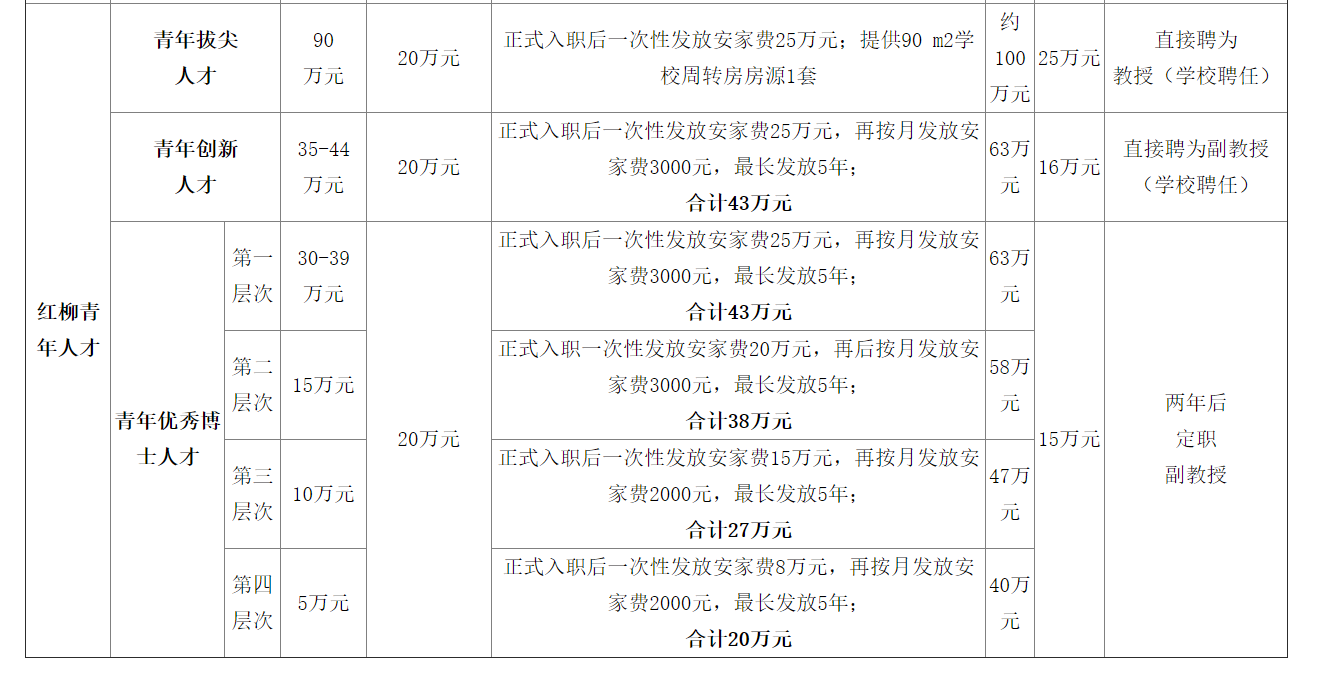 ?。ㄈ┘t柳青年創(chuàng)新人才正式入職后直接聘為副教授(學(xué)校聘任),享受事業(yè)單位工資待遇(博士)、校內(nèi)績效津貼和學(xué)校相應(yīng)人才待遇及福利(具體見下表)。其中,校內(nèi)績效津貼參照學(xué)??冃Ы蛸N制度副教授二級的標準(5.5萬元/年)執(zhí)行。
