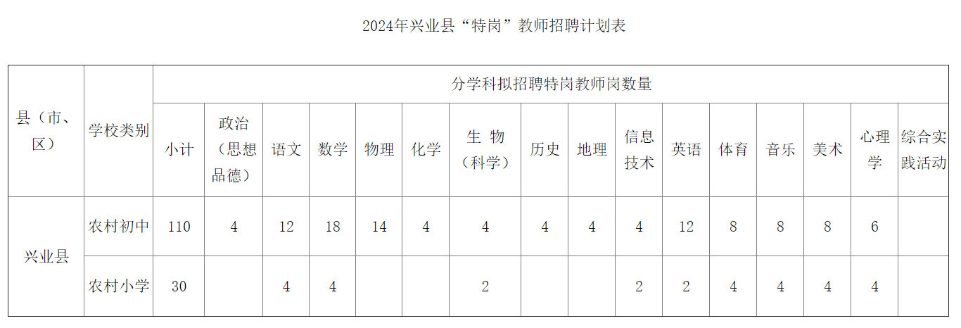 附件: 2024年興業(yè)縣特崗教師招聘計劃表