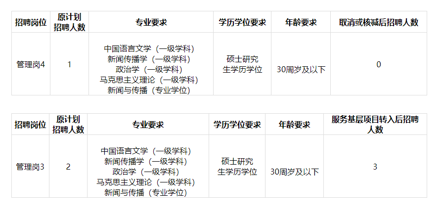 根據(jù)《山西醫(yī)科大學汾陽學院2024年公開招聘工作人員工作方案》要求,我院公開招聘資格審查工作已結(jié)束。根據(jù)公告要求和實際報名情況,按照“崗位資格審查合格人數(shù)與擬招聘人數(shù)原則上應(yīng)達3:1以上方可開考,報名人數(shù)不達該比例的招聘崗位,按規(guī)定的比例相應(yīng)核減崗位,如減少到1名仍達不到3:1的崗位,原則上取消招聘崗位”與“服務(wù)基層項目人員專門崗位在報名結(jié)束后未達規(guī)定比例被取消的,將崗位招聘計劃和報名人員轉(zhuǎn)入一般性崗位(轉(zhuǎn)入專業(yè)要求、其他要求等相同的崗位)”的規(guī)定,經(jīng)學院公開招聘領(lǐng)導(dǎo)組研究,決定將管理崗位4(服務(wù)基層項目人員專門崗位)取消,其崗位招聘計劃和報名人員轉(zhuǎn)入一般性崗位管理崗位3。具體如下: