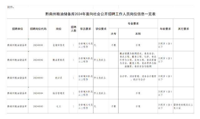 附表:黔南州糧油儲(chǔ)備庫(kù)2024年面向社會(huì)公開招聘工作人員崗位信息一覽表