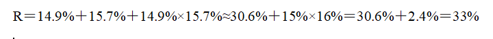 ,代入公式得,R=14.9%+15.7%+14.9%×15.7%≈30.6%+15%×16%=30.6%+2.4%=33%。根據(jù)公式,增長(zhǎng)率=(現(xiàn)期量-基期量)/基期量=現(xiàn)期量/基期量-1,則現(xiàn)期量/基期量=1+增長(zhǎng)率,代入公式得,2013年3月末,金融機(jī)構(gòu)人民幣各項(xiàng)貸款余額約是2011年同期的倍數(shù)=1+33%=1.33倍。與C選項(xiàng)最接近。
