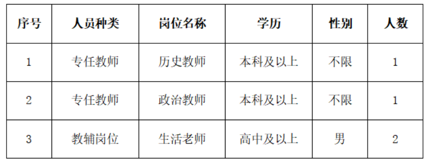 因?qū)W校實(shí)際用人需求,現(xiàn)招聘專任教師2名、教輔崗位2名。其中,歷史教師1名、政治教師1名、生活老師2名(男)。