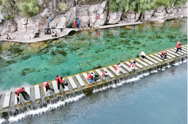 2024年6月5日是世界環(huán)境日。世界環(huán)境日前后,各地志愿者、環(huán)保工作者等以實(shí)際行動保護(hù)生態(tài)環(huán)境,守護(hù)美麗家園。圖為2024年6月4日,志愿者在河北省邯鄲市峰峰礦區(qū)黑龍洞風(fēng)景區(qū)撿拾水面雜物。新華社發(fā) 郝群英/攝