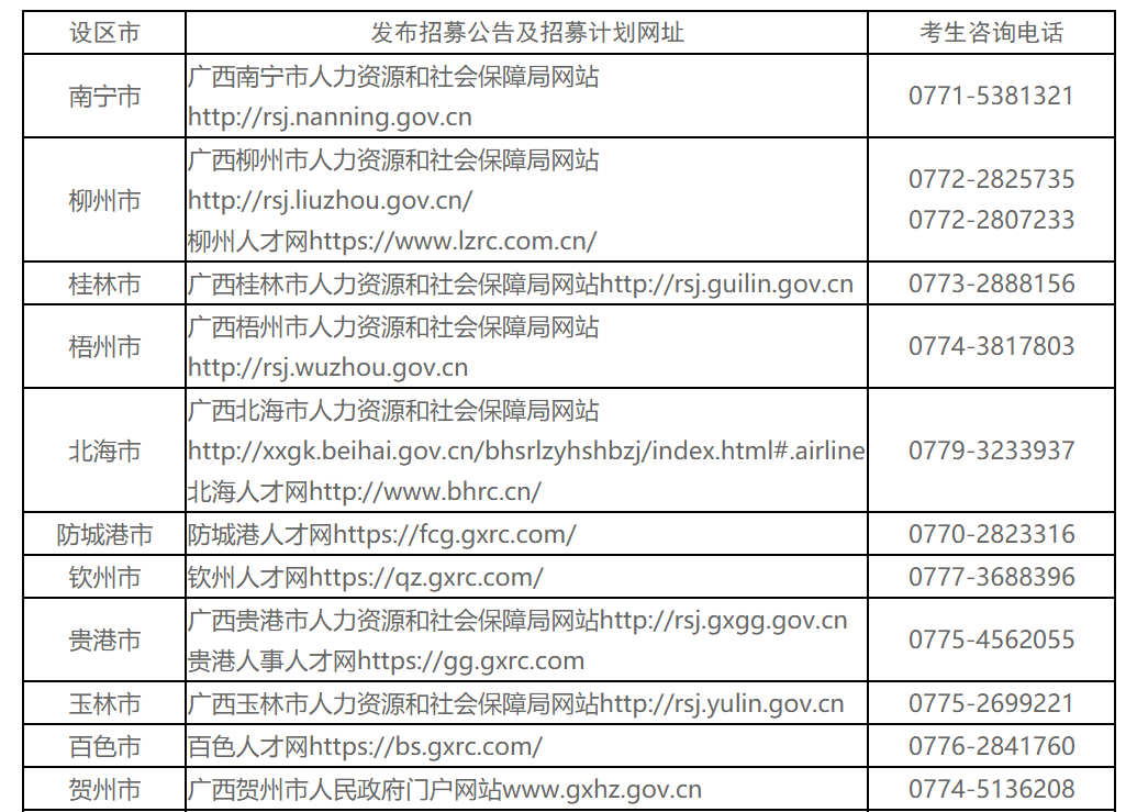 附件:廣西14個設(shè)區(qū)市發(fā)布招募公告網(wǎng)址及咨詢電話