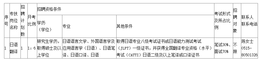 為更好地選拔優(yōu)秀適崗人才,充實外事人員隊伍,優(yōu)化人員結構,鹽城市人民政府外事辦公室(下稱市外辦)直屬單位鹽城市國際交流中心(全額撥款)現(xiàn)決定面向社會公開招聘日語翻譯1名?,F(xiàn)將有關事項公告如下: