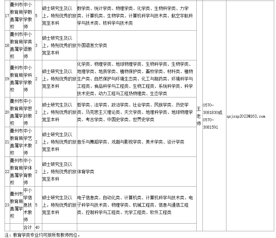 根據(jù)衢州市直(單位)公辦學(xué)校辦學(xué)需求,本次碩博專場(chǎng)(二)計(jì)劃招聘事業(yè)編制教育人才40人(具體單位、崗位、人數(shù)和報(bào)考資格條件詳見附件1)。